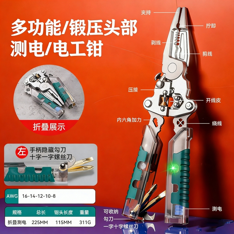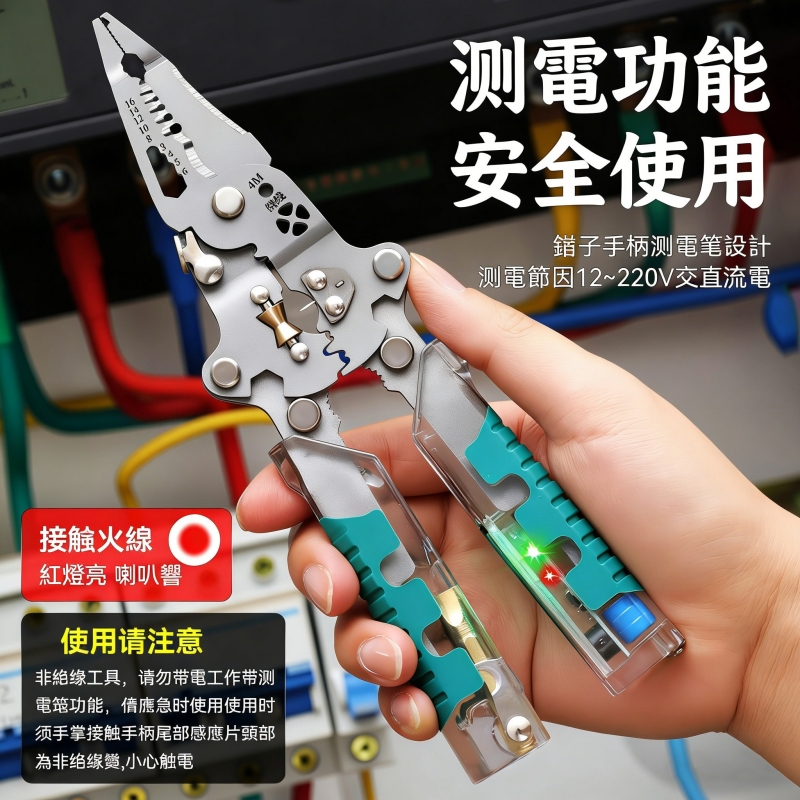 多功能測電剝線鉗|測電・剪切・分線・剝線・夾持・斷絲・擰卸・繞線|八合一水電神器,一把搞定所有工序!】